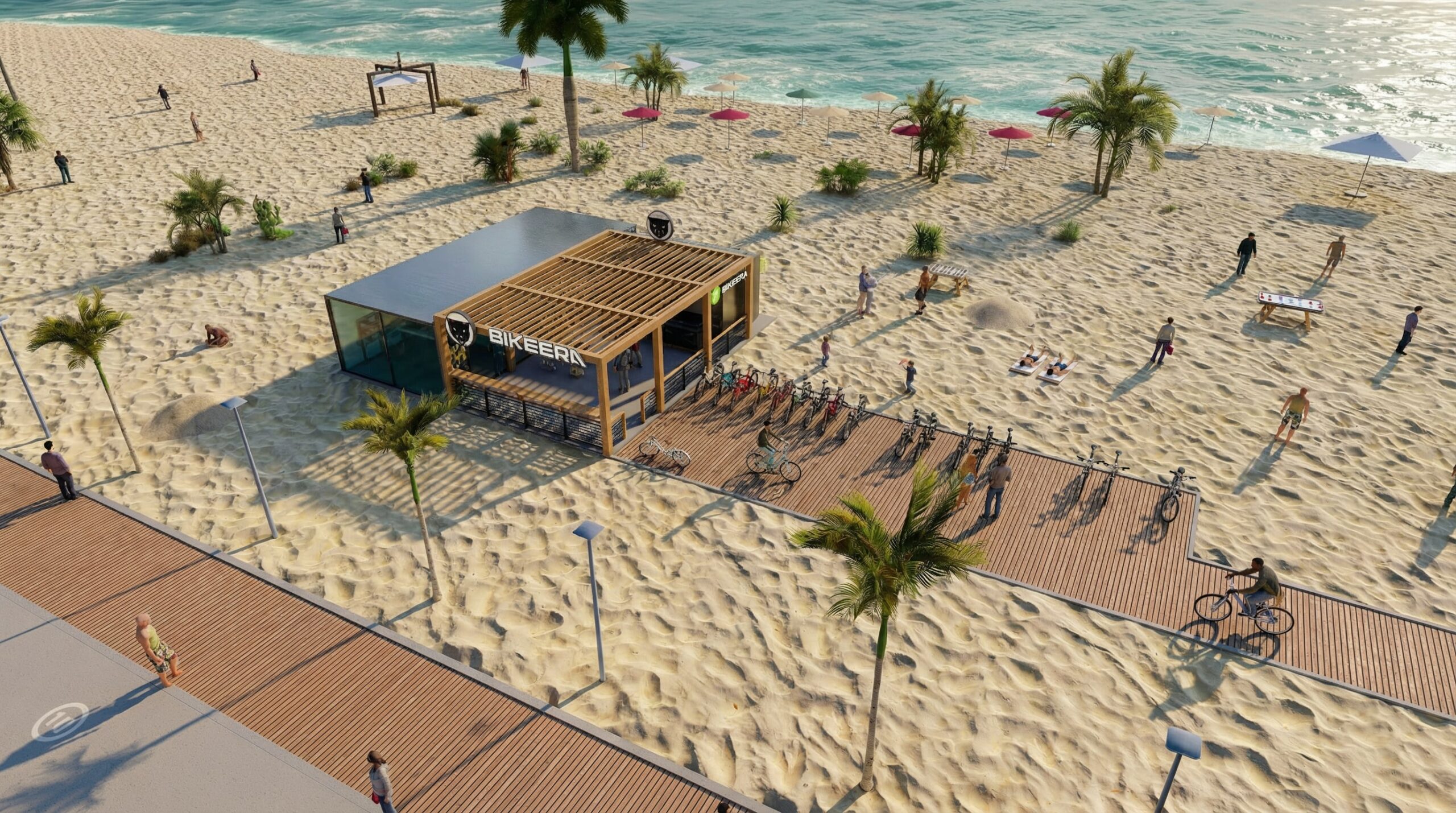 A stylish steel-structure container with a coffee shop caravan, designed for bicycle enthusiasts to rent bikes and enjoy specialty coffee by the beach, creating the perfect blend of adventure and relaxation.